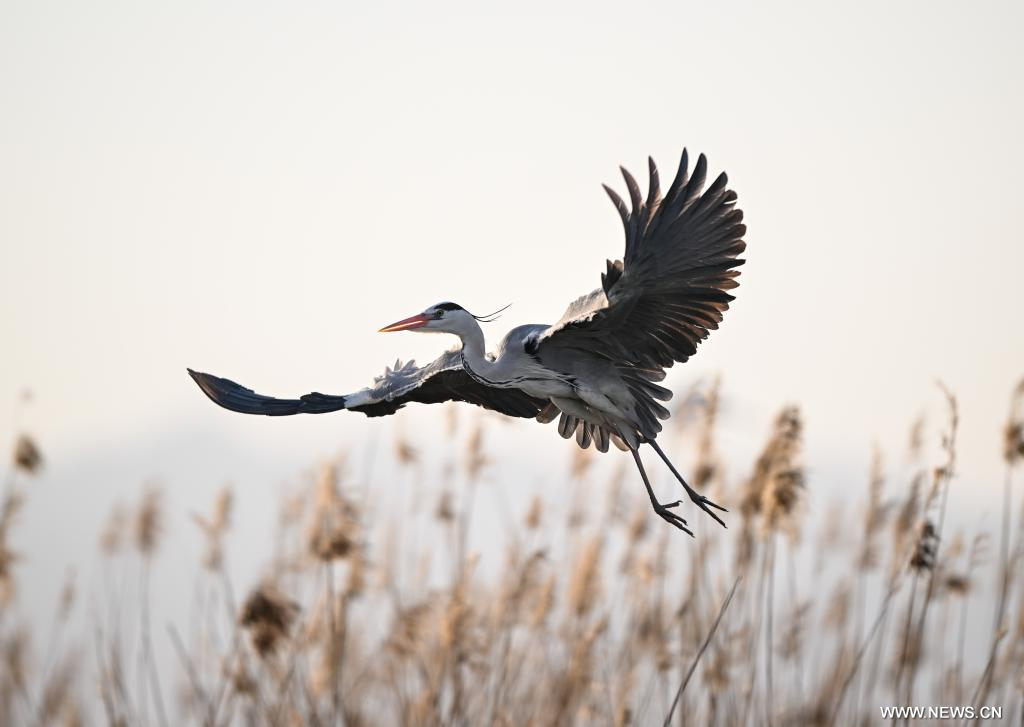 يينتشوان 19 أبريل 2026 (شينخوا) في الصورة الملتقطة يوم 17 أبريل 2026، طائر مالك الحزين يحلق بين القصب في منطقة شاهو السياحية بمحافظة بينغلوه في منطقة نينغشيا ذاتية الحكم لقومية هوي بشمال غربي الصين.